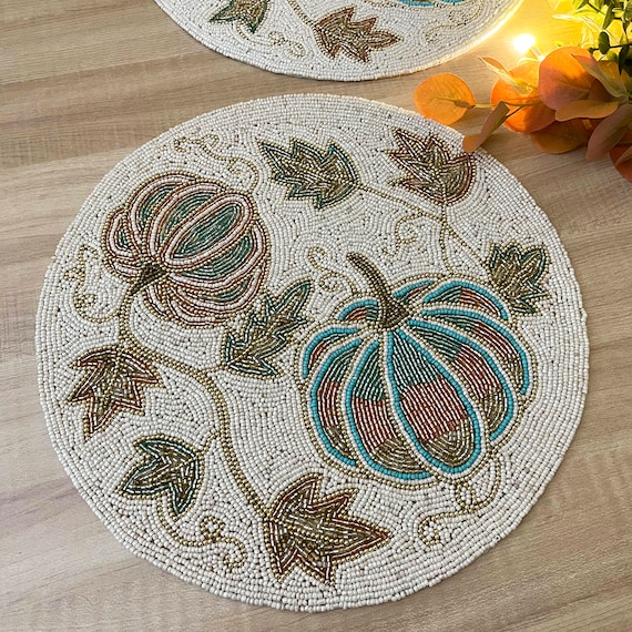 Bring the warmth of fall to your table with our Autumn Harvest Beaded Placemat. Featuring a beautifully hand-beaded design of pumpkins and vines in earthy tones of ivory, teal, and gold, this round placemat adds a rustic yet elegant touch to seasonal dining.