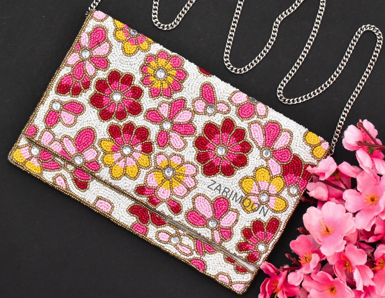 The Blossom Bliss Beaded Purse brings a vibrant garden to life in your accessory collection. With its stunning floral design in shades of pink, yellow, and red, accented by shimmering crystal beads, this purse is a perfect blend of elegance and playfulness. Hand-beaded on a white base, it features a secure flap closure and a sleek chain strap for versatile styling. Ideal for daytime events or evening parties, this clutch adds a burst of color and charm to any outfit, making it a true showstopper.