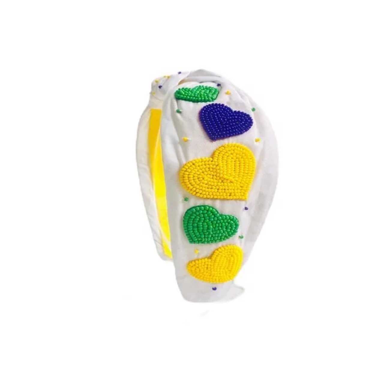 Celebrate love and joy with this heart-themed beaded masterpiece! Featuring vibrant Mardi Gras colors, each heart is meticulously hand-stitched with bold beads to create a look full of energy and fun.
