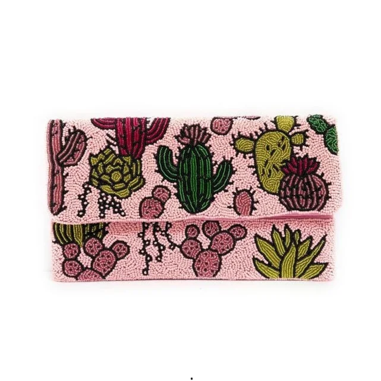 Celebrate the charm of the desert with the Desert Bloom clutch, featuring vibrant cactus and succulent beadwork on a soft pink backdrop.