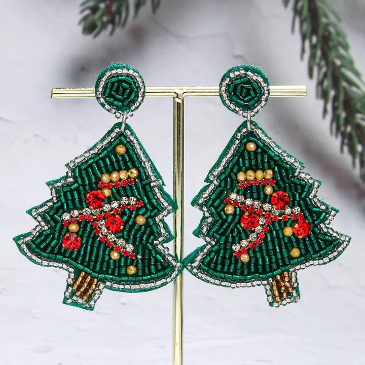 Bring the holiday cheer to your wardrobe with these beaded Christmas tree earrings! Adorned with sparkling red and gold details, these earrings are the perfect accessory for holiday parties, festive gatherings, or just spreading seasonal joy.