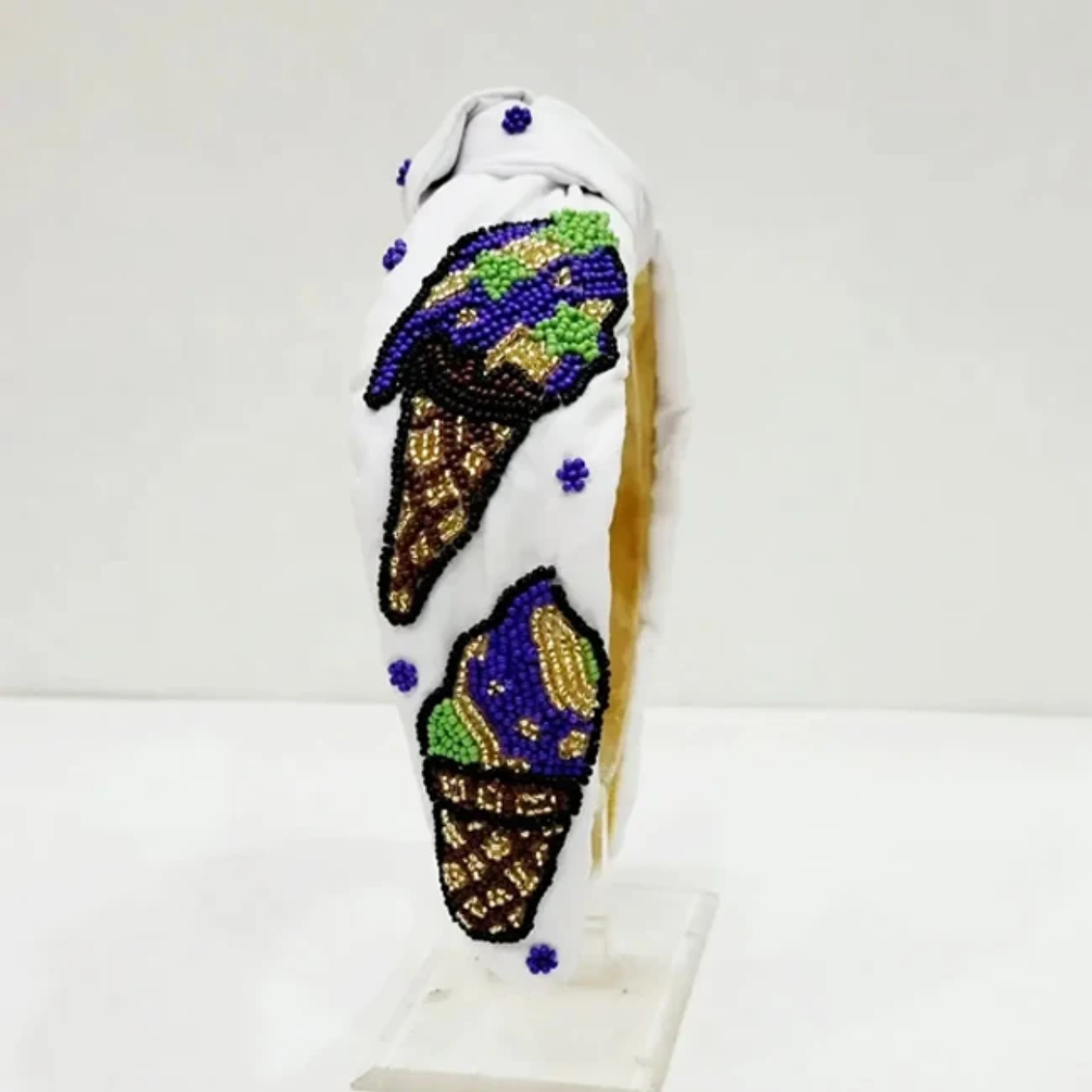 Indulge in sweet style with our Frosty Treat Beaded Headband, featuring intricately hand-beaded ice cream cones in shades of purple, gold, and green on a soft white base.