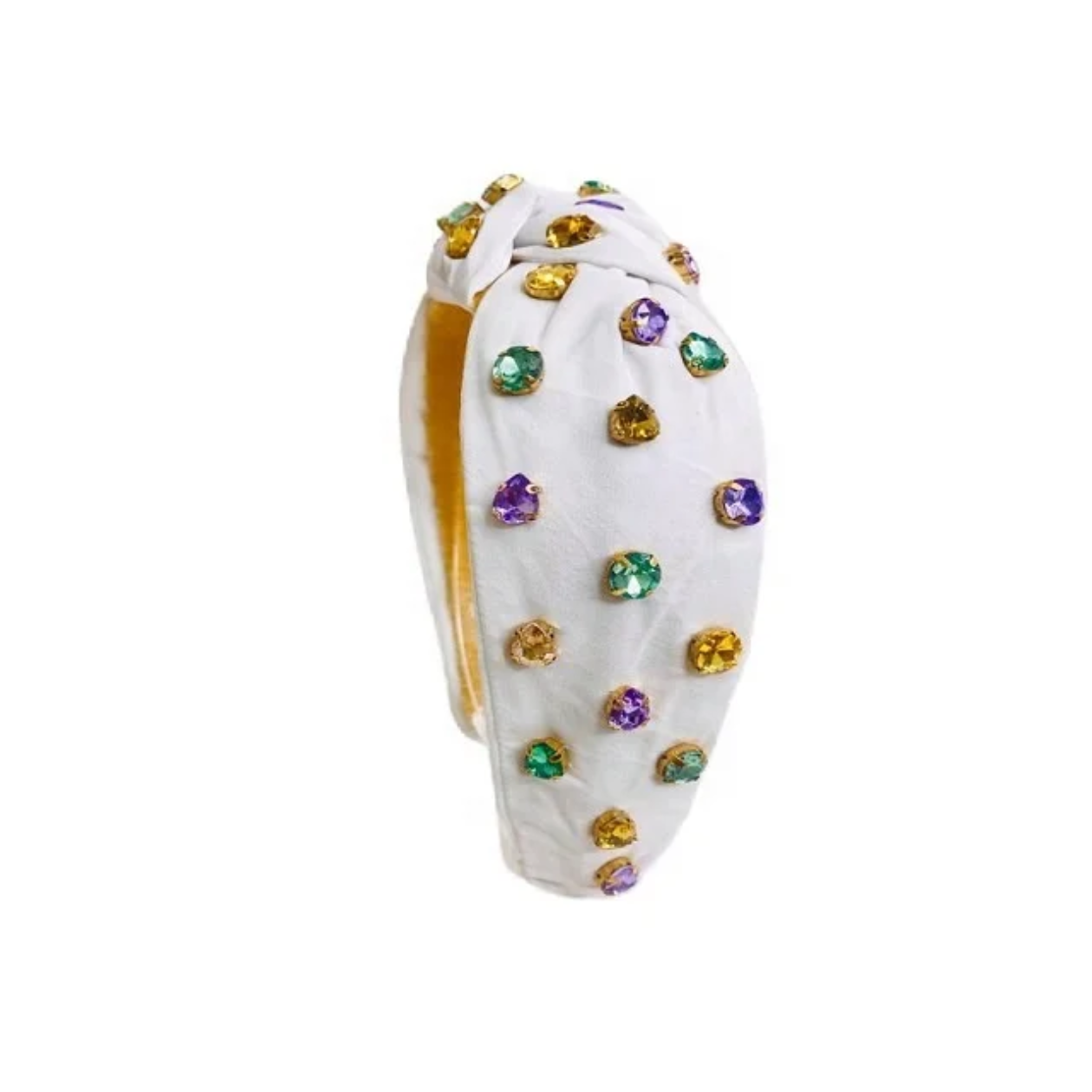 Make a statement with this elegant white headband, adorned with sparkling gold, emerald, and amethyst rhinestones.