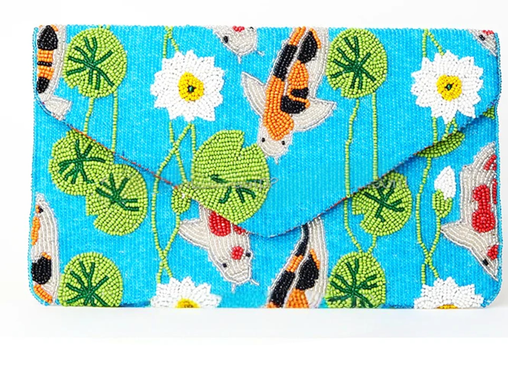 The Koi Pond Elegance Clutch is a tranquil blend of artistry and sophistication. Featuring vibrant hand-beaded koi fish swimming amidst lush lotus leaves and blossoms, this accessory captures the essence of a serene aquatic paradise. The brilliant blue background adds a refreshing pop of color, while the detailed craftsmanship speaks to its luxurious appeal. Perfect for garden parties, summer events, or as a unique gift, this clutch is a conversation starter that reflects grace and style in every detail. Secure your essentials with its elegant flap closure and let this masterpiece elevate your outfit effortlessly.