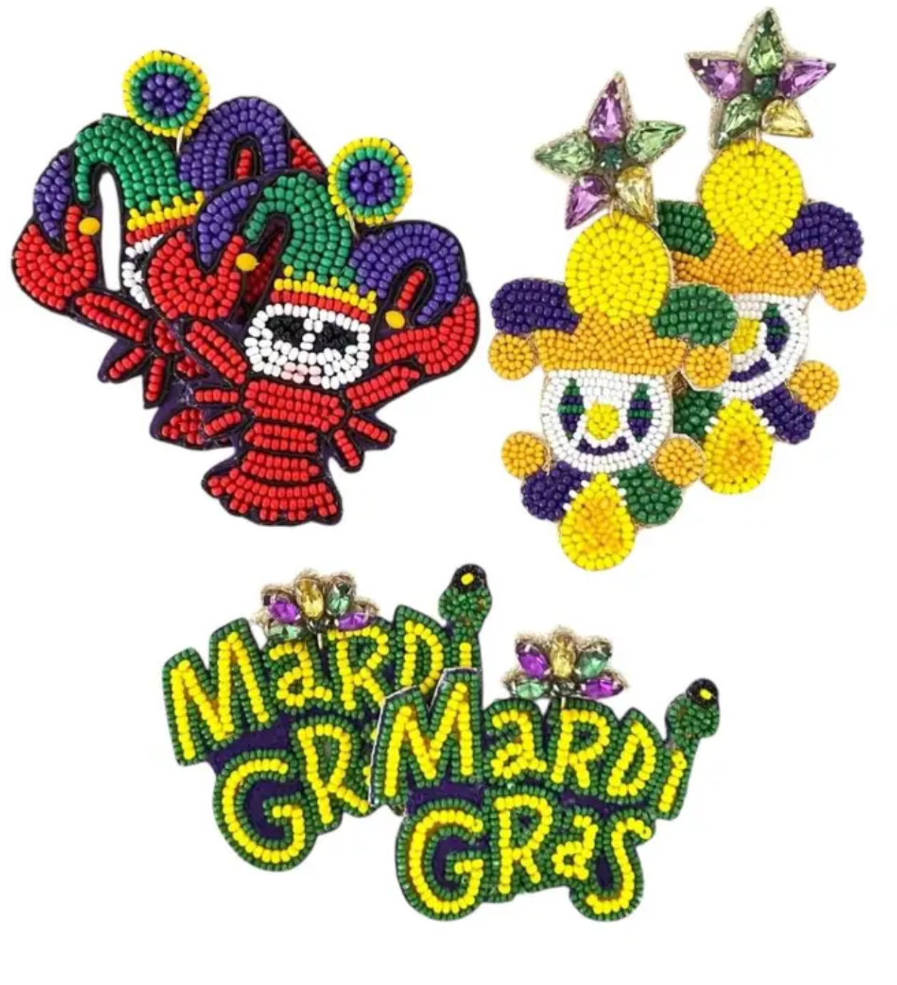 Celebrate the spirit of Mardi Gras with these vibrant beaded earrings! Featuring fun jester hats, festive crawfish, and bold “Mardi Gras” text designs, these statement earrings are handcrafted with intricate beads and rhinestone details. Perfect for adding a lively and colorful touch to your carnival celebrations.