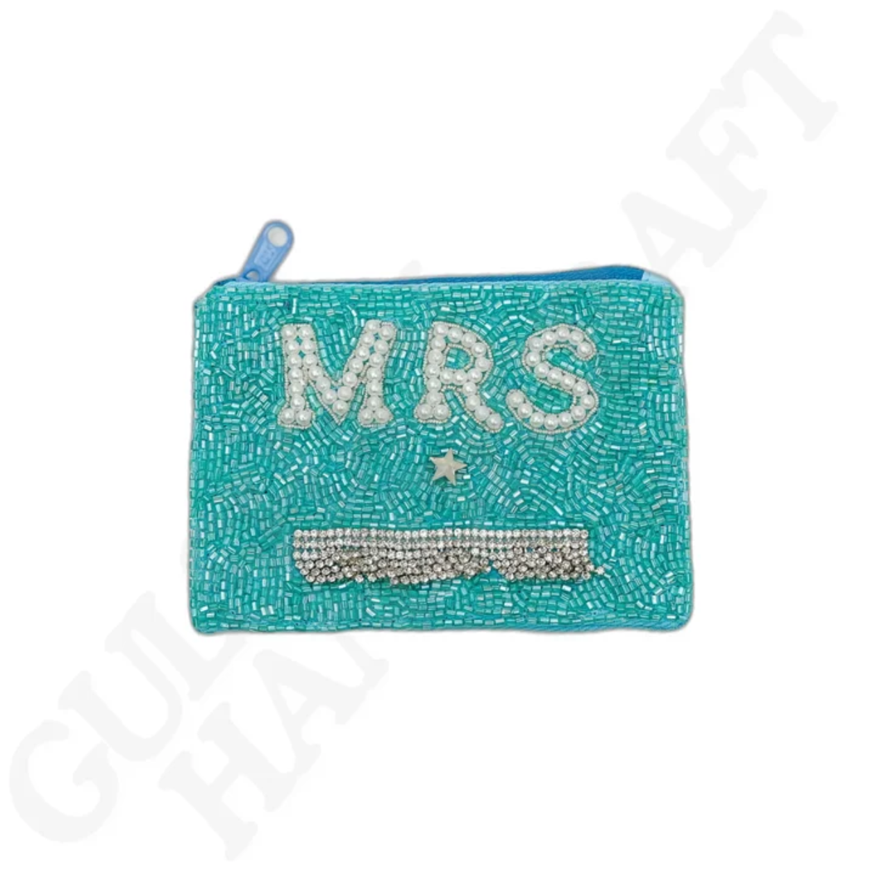 A perfect gift for the bride-to-be or a newlywed, this turquoise beaded coin pouch sparkles with “MRS” lettering in pearly white beads and rhinestone accents. Compact yet stylish, it’s designed to hold your small essentials while adding a hint of elegance to your accessory collection.