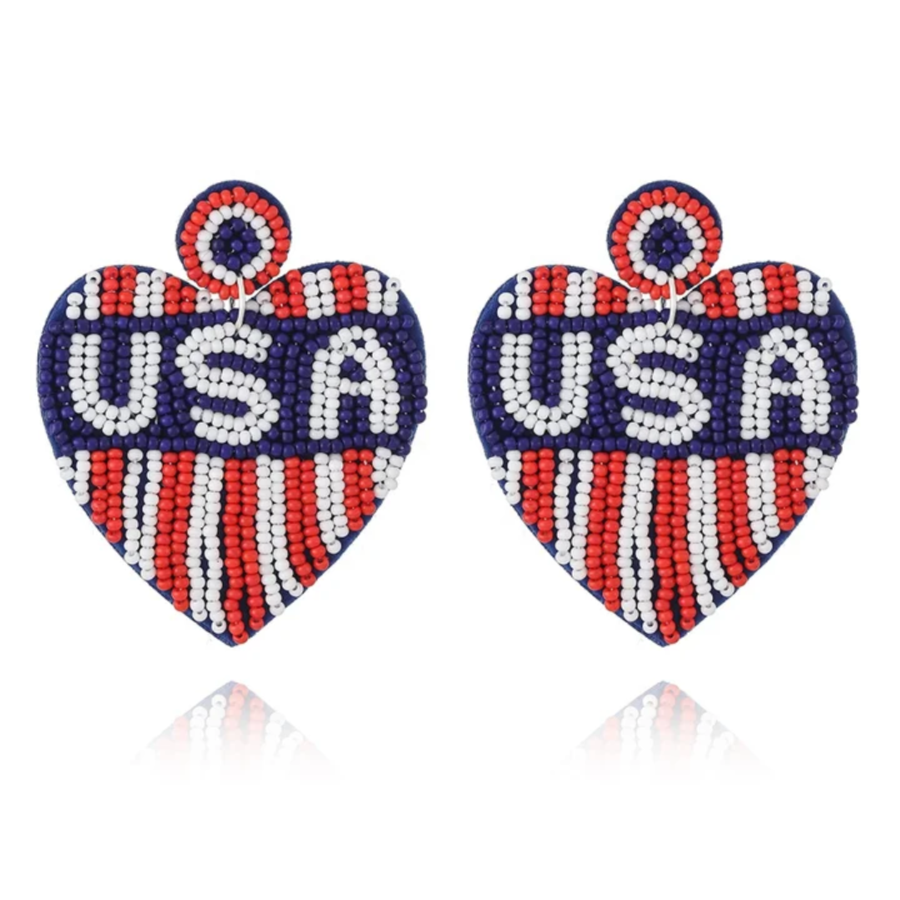 Show your love for the USA with these beautifully handcrafted beaded earrings. Designed in a heart shape with red, white, and blue seed beads, these earrings proudly display “USA” in bold letters. Perfect for celebrating Independence Day, Memorial Day, or any patriotic occasion!