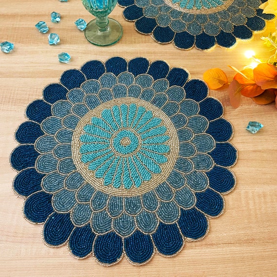 Transform your dining table into a regal setting with the Royal Bloom Beaded Placemat. Featuring a captivating floral-inspired pattern in shades of deep navy and turquoise, this placemat is meticulously handcrafted with shimmering beads and metallic accents. The intricate detailing creates an enchanting, elegant touch perfect for dinner parties, holiday gatherings, or special occasions. Designed to protect and elevate your tabletop, this round placemat is an artistic blend of style and functionality.