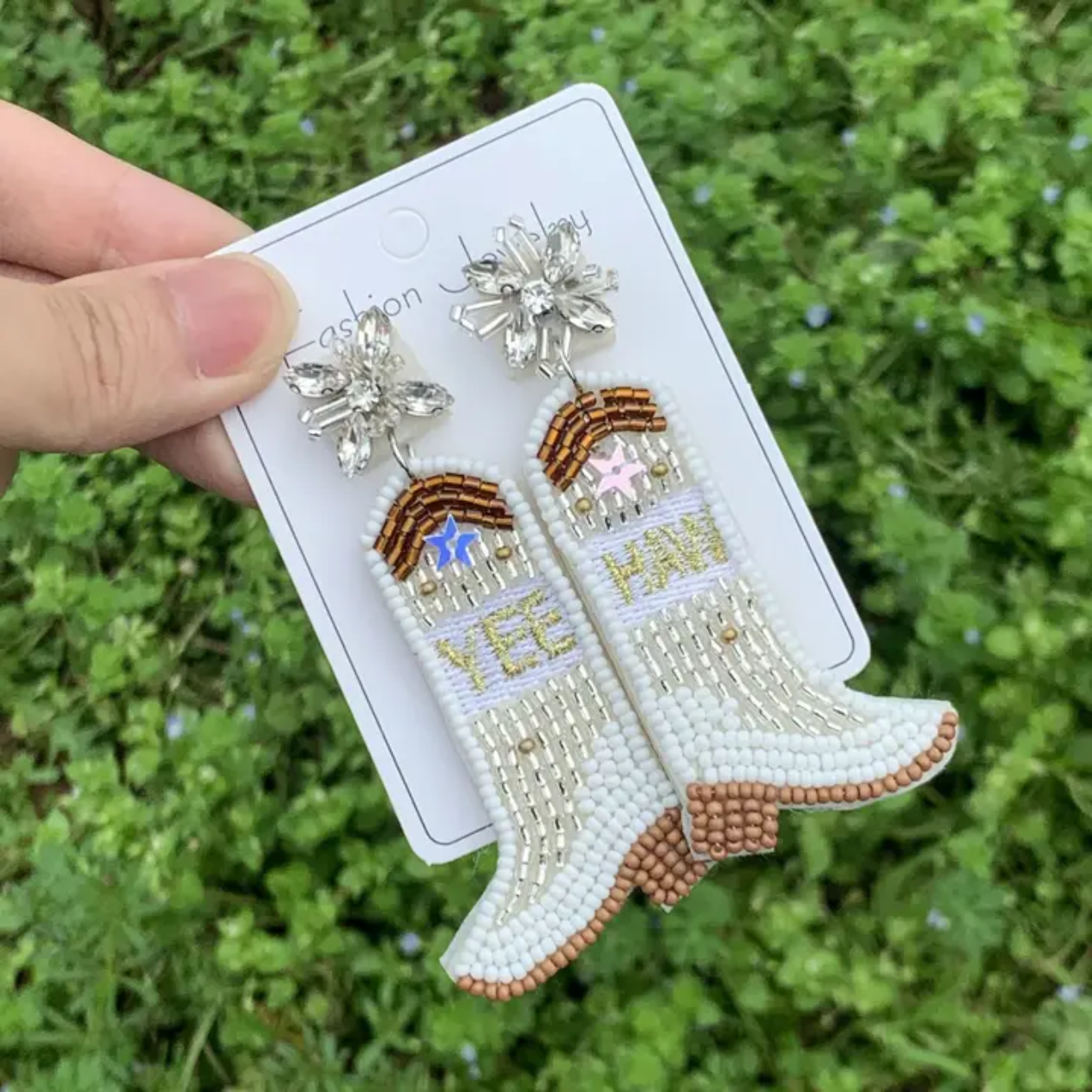 A glamorous take on the classic cowboy boot, these silver and white beaded earrings are a statement piece for Western fashion lovers. With dazzling rhinestones and intricate beadwork, they’re ideal for country concerts, rodeos, or simply making a bold fashion statement.