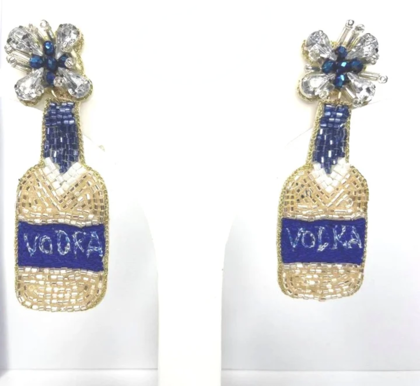 Elevate your party outfit with these dazzling Vodka Sparkle Earrings, featuring intricately handcrafted beadwork that replicates a luxurious vodka bottle. The golden shimmer and deep blue accents exude opulence, while the floral crystal embellishments at the top add a touch of glamour. Perfect for cocktail nights, celebrations, or any occasion where fun and sophistication meet.